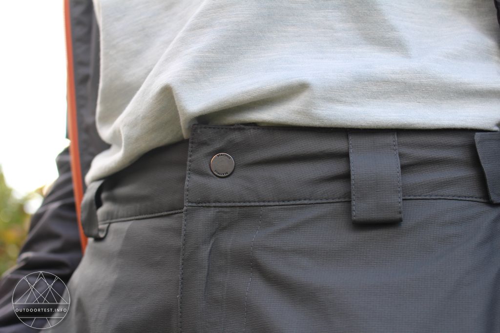 Der Hosenbund ist extra breit und weich unterlegt. Die Gürtelschlaufen sind groß, so dass wirklich jeder Gürtel hindurch passt. Links und rechts am Bund befinden sich Klettstreifen, mit denen die Weite individuell reguliert werden kann. Dies ist sehr praktisch, weil man so auch ohne Gürtel die Hose passend in der Weite einstellen kann. Somit drückt kein Gürtel unter dem Bauchgurt oder Rucksackgewicht.