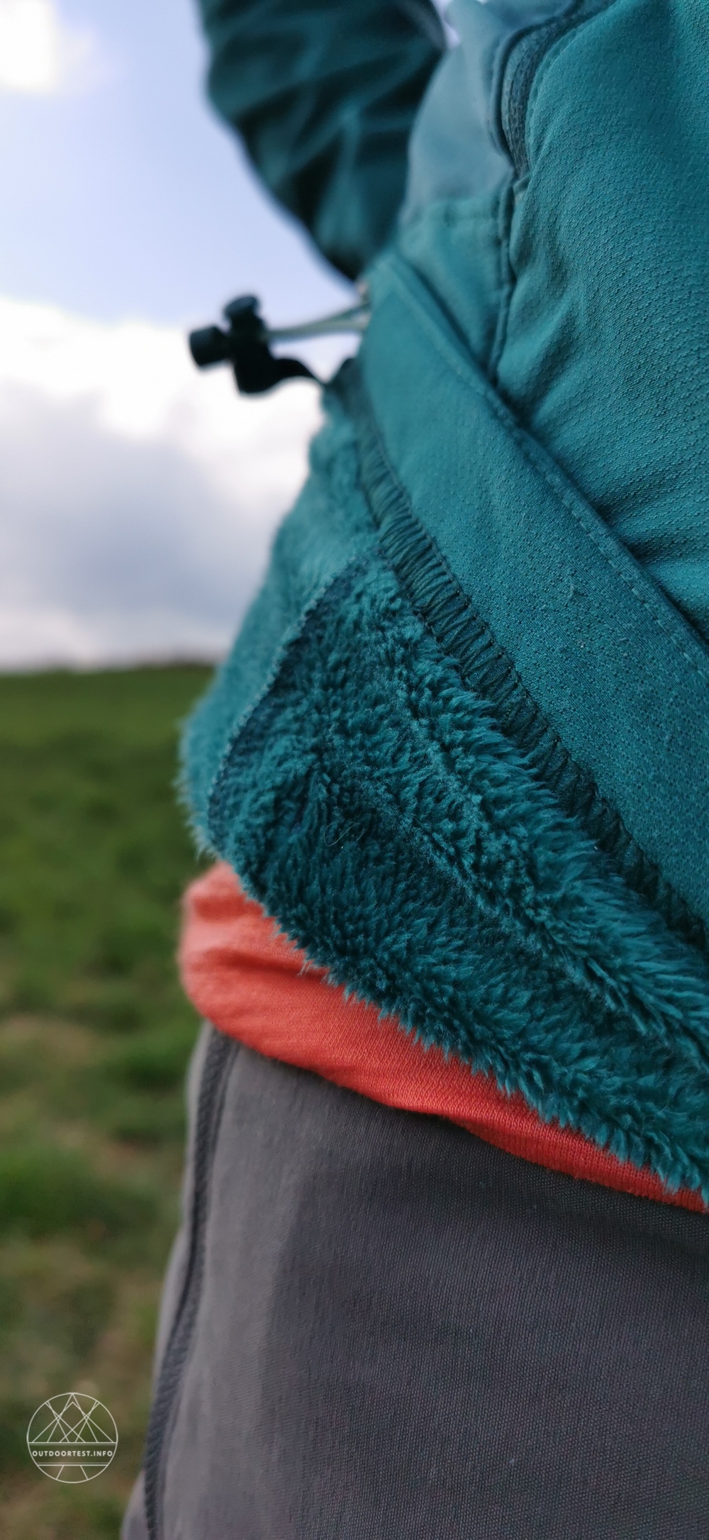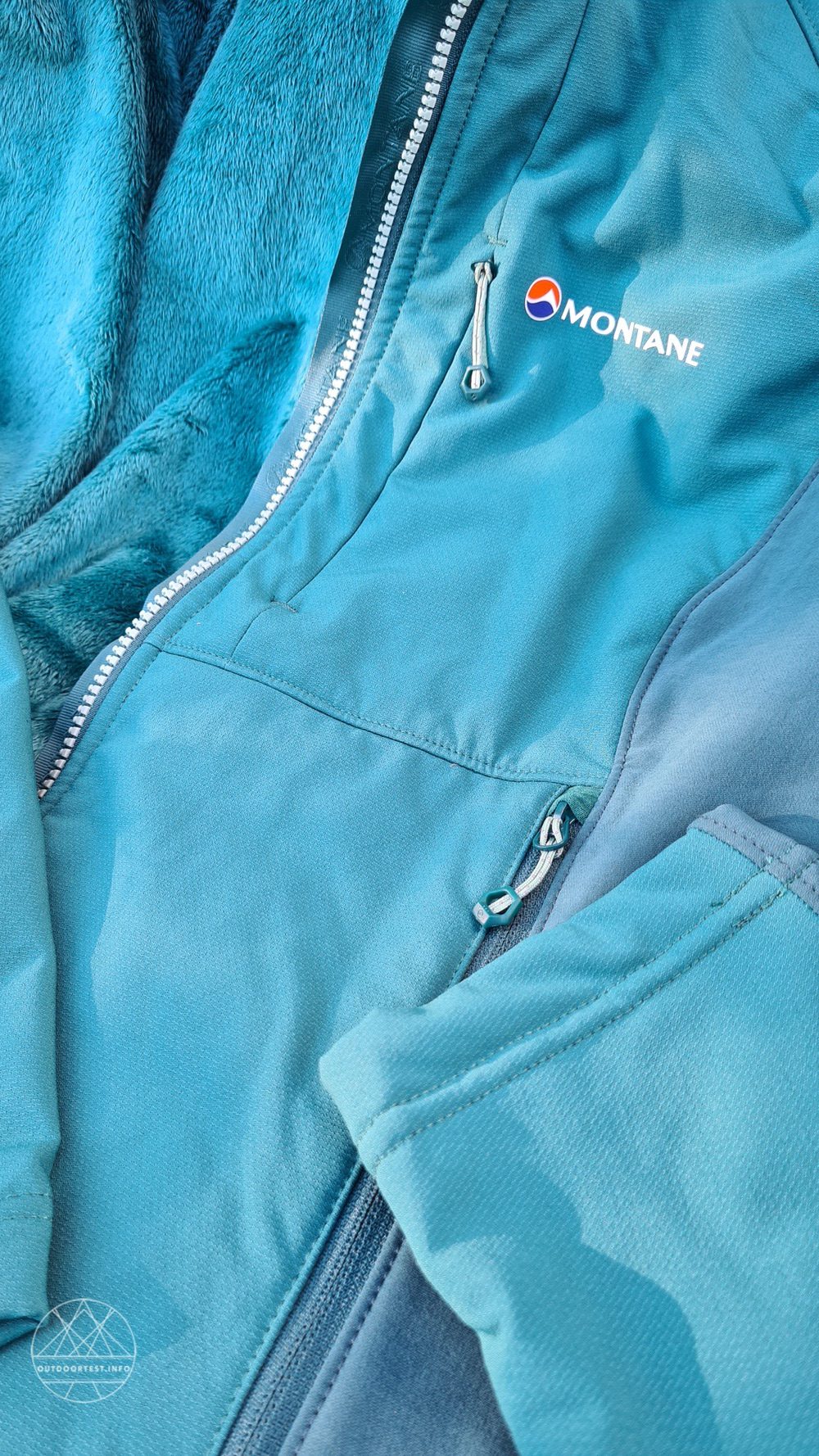 Der „hochflorige“ Innenstoff irritiert ein wenig. So etwas hätte ich eher für Herbst-/Winterjacken erwartet. Unter den Armen und Flanken hat Montane ein sogenanntes „Granite Loft“-Gewebe (ähnlich einem Fleece) eingearbeitet, da hier der Wärmerückhalt etwas vernachlässigt werden kann. Im Test werden wir sehen, ob das Hochflorgewebe insgesamt nicht zu warm ist und ob überhaupt Feuchtigkeit transportiert wird. Auf der Innenseite sind keine Taschen aufgenäht, aber auf der Außenseite, an den Seiten zwei ausreichend große Taschen und eine kleinere Tasche mit verdecktem Reißverschluss auf der linken Seite der Brust. Diese beiden Taschen sind überraschend großzügig und können problemlos ein größeres Smartphone und mehrere Utensilien unterbringen. Die Taschen sind jeweils mit Mesh-Gewebe ausgestattet und könnten im geöffneten Zustand die Luftzirkulation der Jacke unterstützen. Die Brusttasche ist nur für kleine Gegenstände geeignet. Der durchgehende YKK VISLON®-Frontreißverschluss wurde mit einer innenliegenden Windblende versehen, auf die der Montane-Schriftzug gestickt ist. Die Kapuze kann über elastische Bänder zugezogen werden und ist zusätzlich mit einem drahtverstärkten Schirm ausgestattet. Die Abschlüsse der Jacke bilden flache Bündchen. Der Saum ist mit einem Kordelzug ausgestattet und kann somit enger gezogen werden. Die Jacke hat eine gewisse Dehnbarkeit und Elastizität und ist sehr hochwertig verarbeitet.