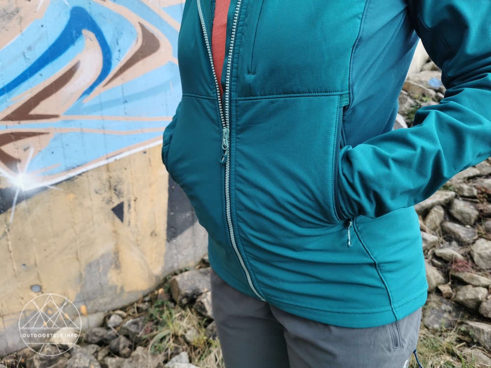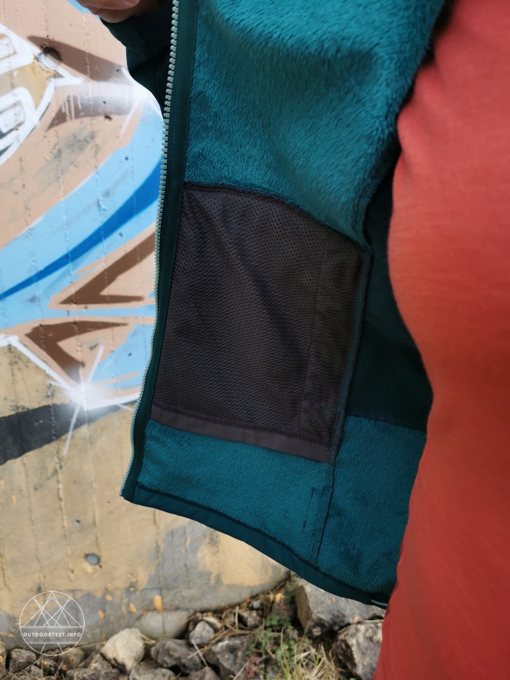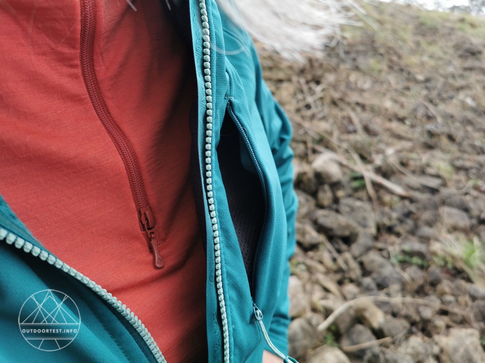 Die beiden Taschen an den Seiten bieten ausreichend Stauraum. So findet hier ein größeres Smartphone genügend Platz oder auch Müsliriegel ect. Die Innenseiten der Taschen sind aus Mesh-Gewebe und lassen sich mit YKK-Reißverschlüssen verschließen. Die Brusttasche ist ebenfalls mit einem Reißverschluss ausgestattet, dieser ist jedoch verdeckt eingearbeitet. Diese Tasche ist kleiner gehalten, so können z. B. Taschentücher oder Bankkarten untergebracht werden. Die Seitentaschen können im geöffneten Zustand unter anderem auch die Luftzirkulation in der Jacke begünstigen. Der Frontreißverschluss läuft sehr gut und ist mit einer innenliegenden Windblende versehen.