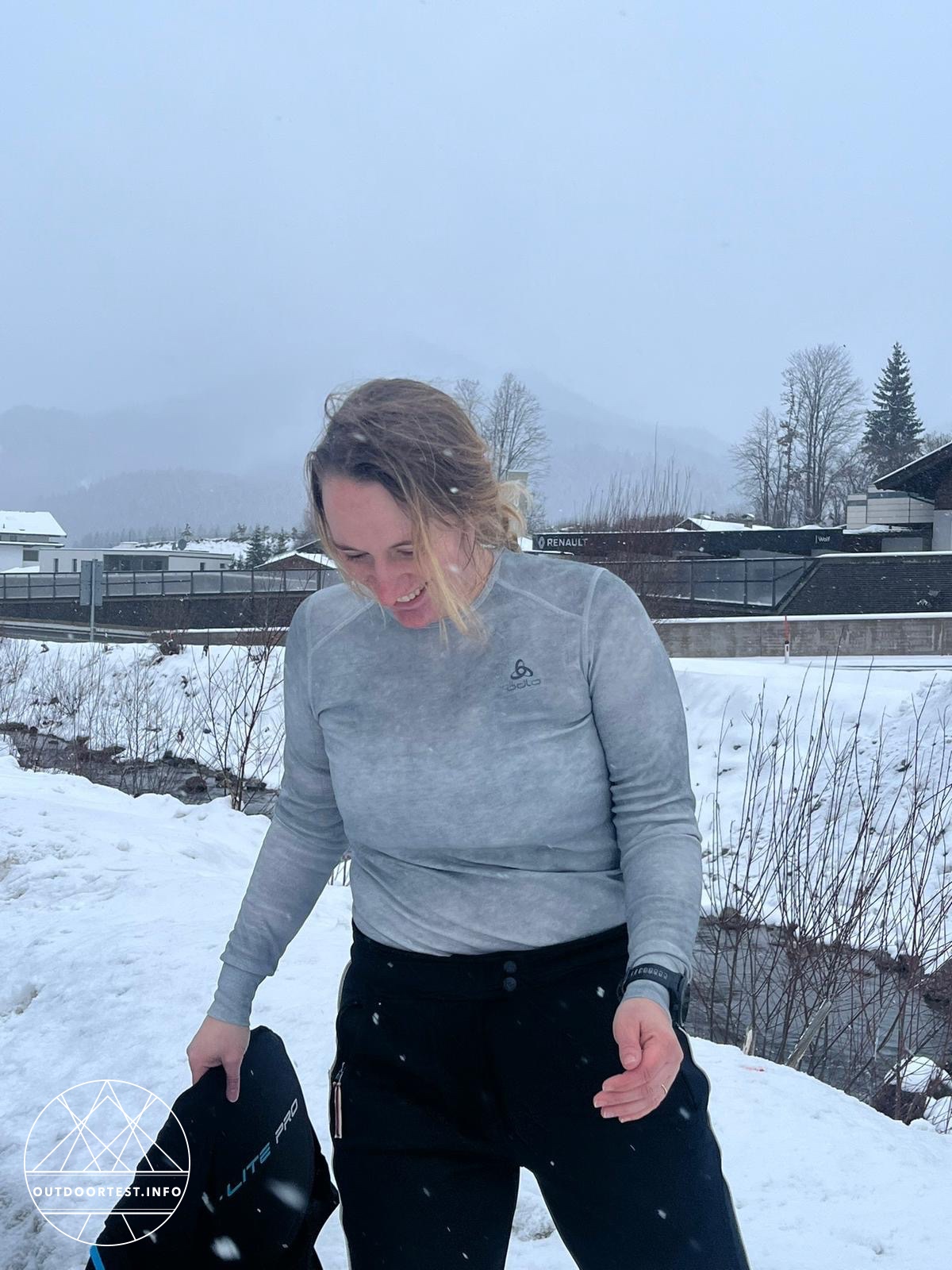 Das Base-Set ist dünn und liegt eng an meiner Haut an, was der Fitted Passform insofern entspricht. Über das Shirt Base-Layer ziehe ich zwei weitere Layer an, einen Buff und final meine Skijacke. Über die Tights ziehe ich direkt meine Skihose an. Ein klares Manko ist, dass mein schwarzer Slip deutlich durch die Hose durchscheint – das Material scheint zu transparent zu sein. Da ich gerne vor oder nach dem Skifahren nur in Skiunterhose zum Beispiel im Auto unterwegs bin, würde dies mit dieser Tight nicht gehen.