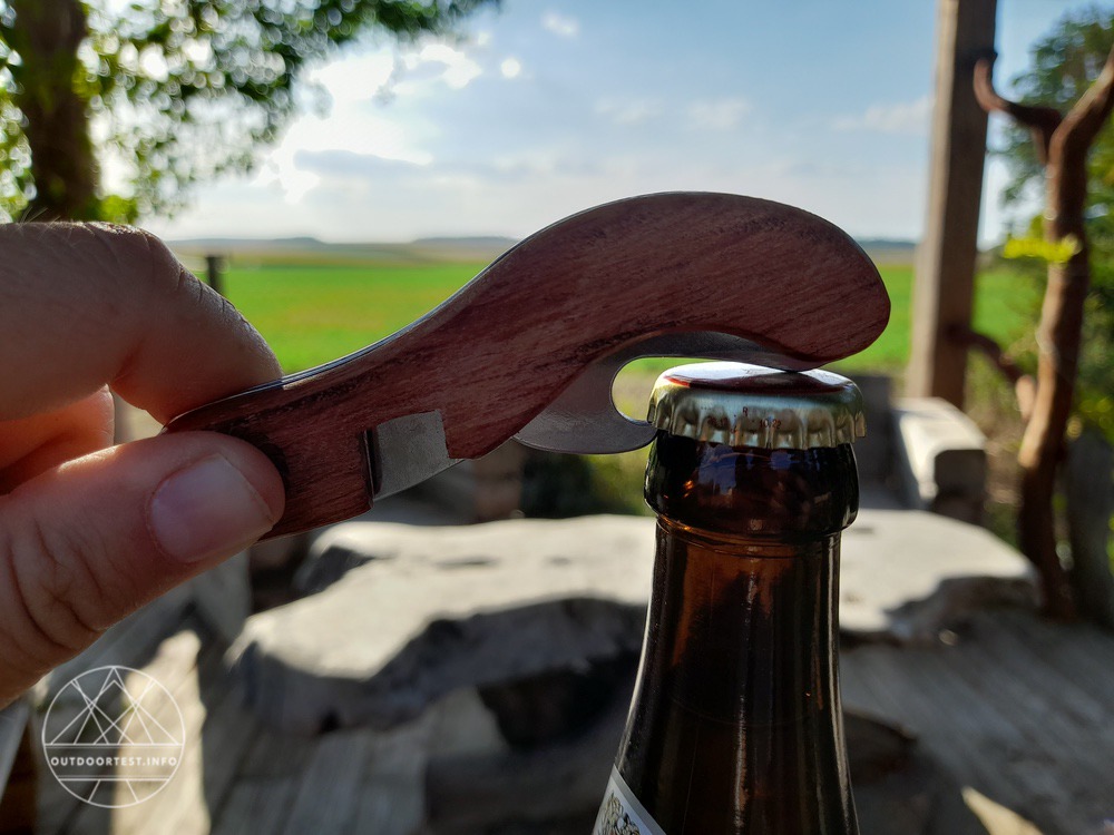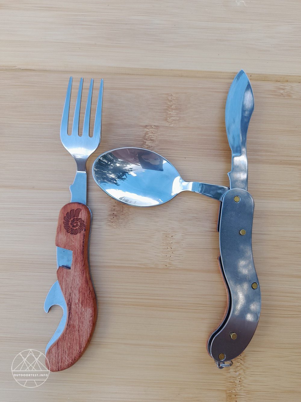 Klappt man die Gabel auf, lässt sich das Set auseinanderschieben und damit in zwei Teile trennen. So hat man dann auf der einen Seite die Gabel und auf der anderen Seite die Wahl zwischen Löffel oder Messer. So lässt es sich ganz entspannt wie ein normales Besteck benutzen. Auf Seite der Gabel befindet sich dann noch der Flaschenöffner.