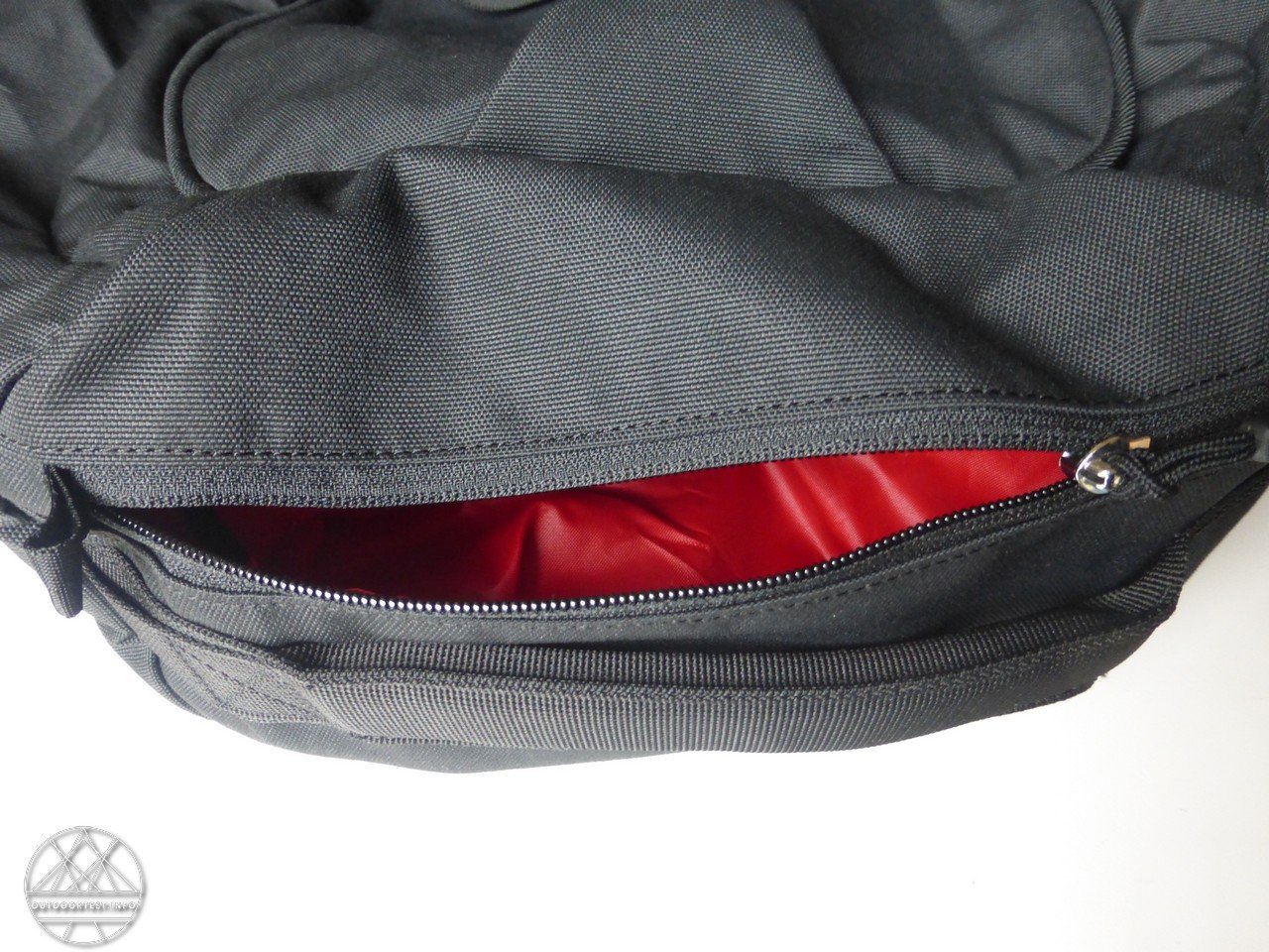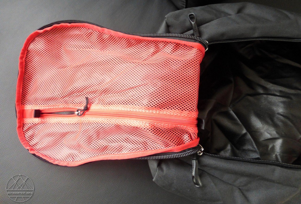 Innenliegend findet sich im Deckel ein farblich Rot abgesetztes Meshfach mit Reißverschluss.