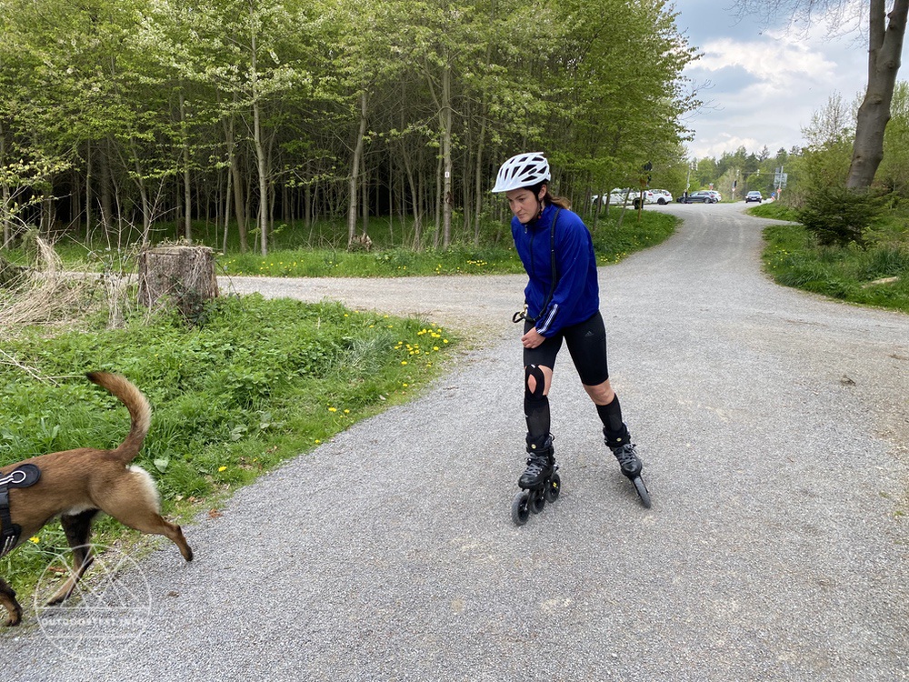 Für Menschen mit zugfreudigen Hunden, die zum Beispiel im Canicross oder Bikejöring unterwegs sind, kann ich die Offroad Inliner einfach nur empfehlen – hier spielt es keine Rolle dass die Gleitphase nicht ganz so gut ist wie bei den üblichen Inlinern, da man ja eigentlich immer einen ordentlichen Antrieb von vorne hat. Dazu kommt, dass man viel mehr Möglichkeiten auf Waldwegen hat, die meist für den Hund angenehmer zu laufen sind als auf Asphalt und man sich keine Gedanken machen muss, sollte man mal mit hohen Geschwindigkeiten über einen Stein oder ähnliches brettern.