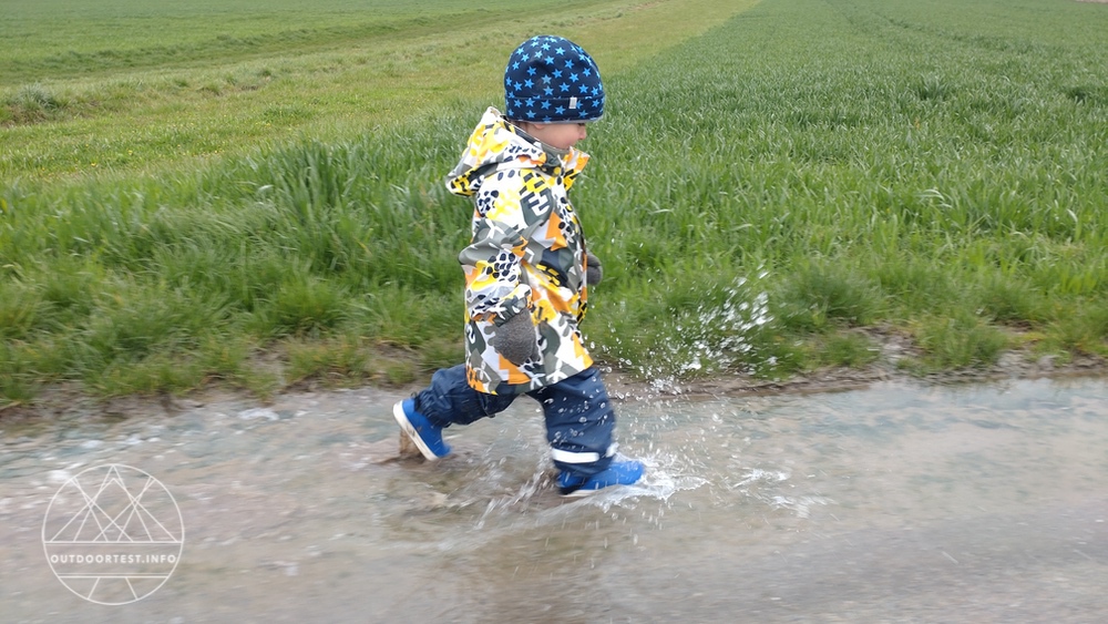 Die Jacke durfte regelmäßig im mehrwöchigen Testzeitraum raus in den Regen, dabei ging es auf Klettergerüste, Dreiräder, Laufräder und natürlich in viele große Pfützen. Dabei musste sie einiges erleiden, sowohl was Nässe als auch mechanische Belastung anging. Unser Tester blieb dabei in Kombination mit einer Matschhose und Gummistiefeln durchweg trocken und fühlte sich wohl. Auch sind keine Abnutzungen zu erkennen.