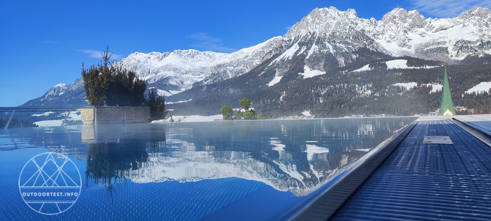 Der Infinity Pool ist ganzjährig auf angenehme 31°C beheizt und steht den Gästen täglich von 07.00 bis 20.00 Uhr zur Verfügung. Hier kann man nicht nur seine Bahnen ziehen, sondern auch am Ende des Pools den Blick auf den Wilden Kaiser genießen und seine Gedanken schweifen lassen, während man im warmen Wasser entspannt.