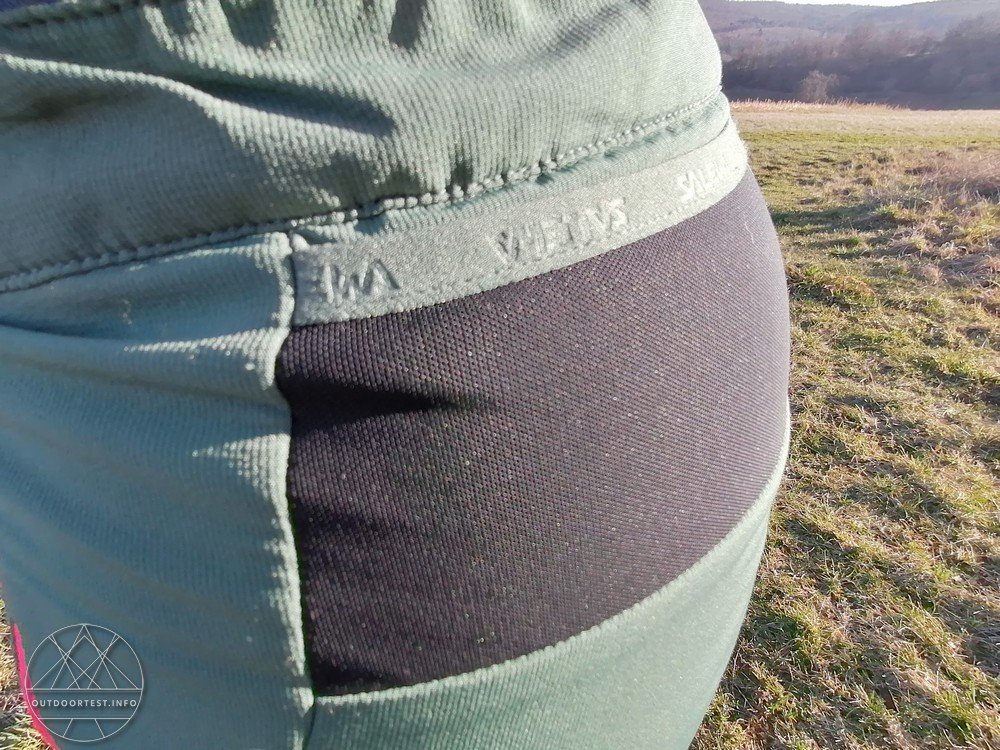 Der Bund ist weich in neonorange innen unterlegt und die Kordel ist nicht durch den Bund hindurch spürbar. Der Rumpf ist eher hoch geschnitten, was bei zugig kalten Temperaturen und einer eher leicht vorgebeugten Haltung beim Tourengehen auch Sinn macht.