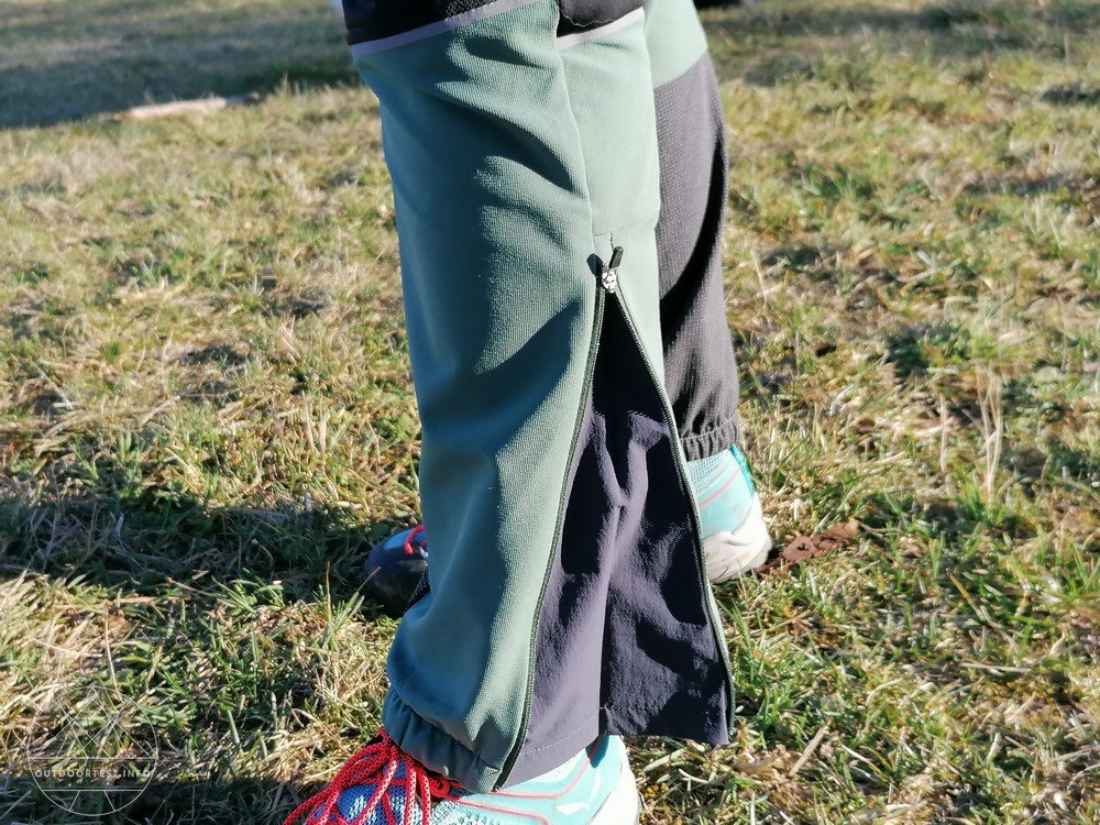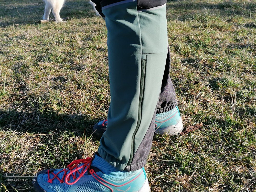 Im Gegensatz zu den meisten Trekking- oder Skihosen ist die Sesvenna eine Schlupfhose. Eigentlich trage ich das nicht gerne, weil bei meiner Figur das in der Regel so aussieht, dass sie um die Hüfte eng sitzt und oben bauscht sie sich am Bund auf, weil sie da zu weit ist und stark gerafft werden muss. Die Passform wird von Salewa als schmal beschrieben. Ich würde es als körpernah und gerade bezeichnen. Sie ist nirgends mega eng und wirft auch kaum Falten. Durch das Bündchen am Hosenbeinabschluss liegt die Hose auf Wunsch dort eng an. Sie kann aber mit einem Reißverschluss entlang des äußeren Knöchels weit hinauf auch lässig weit gestellt werden. So kann die Hose über hohe Wanderstiefel oder auch Tourenstiefel getragen werden.