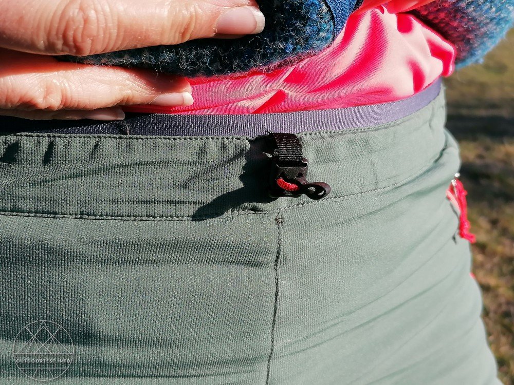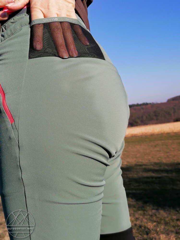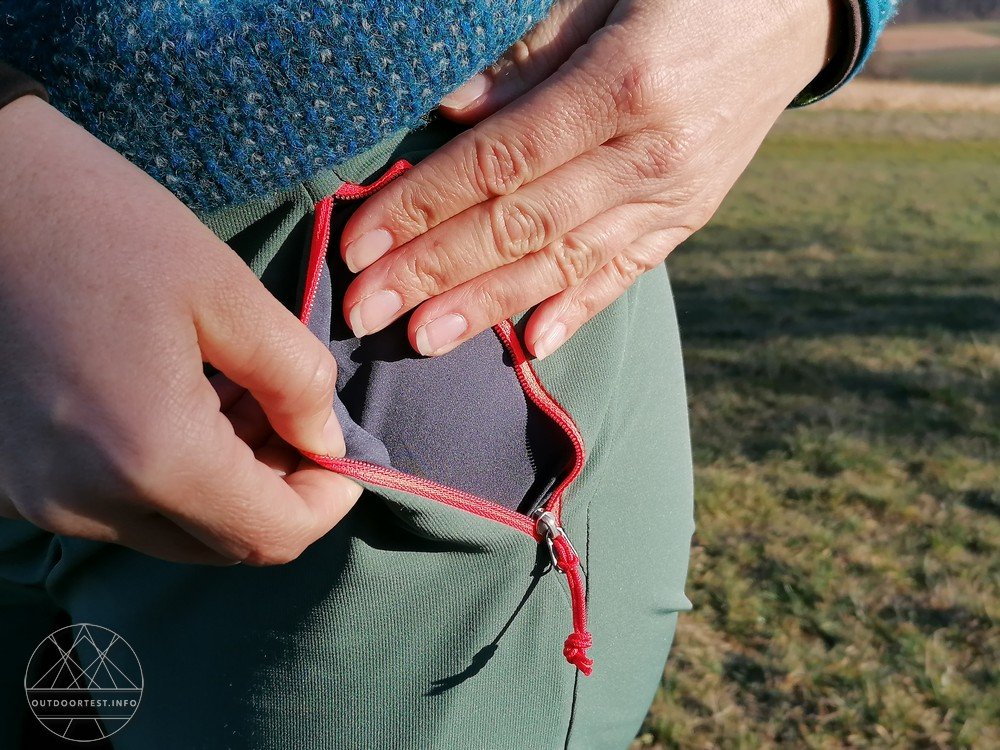 Links und rechts befindet sich je eine Reißverschlussseingriffstasche. Diese sind angenehm tief und tragen nicht auf. Die Reißverschlüsse sind zumindest bei der grünen Hose farblich akzentuiert abgesetzt in neonorange. Hinten verfügt die Hose leider über keine Taschen. In der Nierengegend sind zwei schmale Netzeinschübe aufgenäht. Deren Funktion entzieht sich allerdings meinem Verständnis. Oberschenkeltaschen oder noch eine weitere seitliche RV-Tasche wären wünschenswert gewesen.