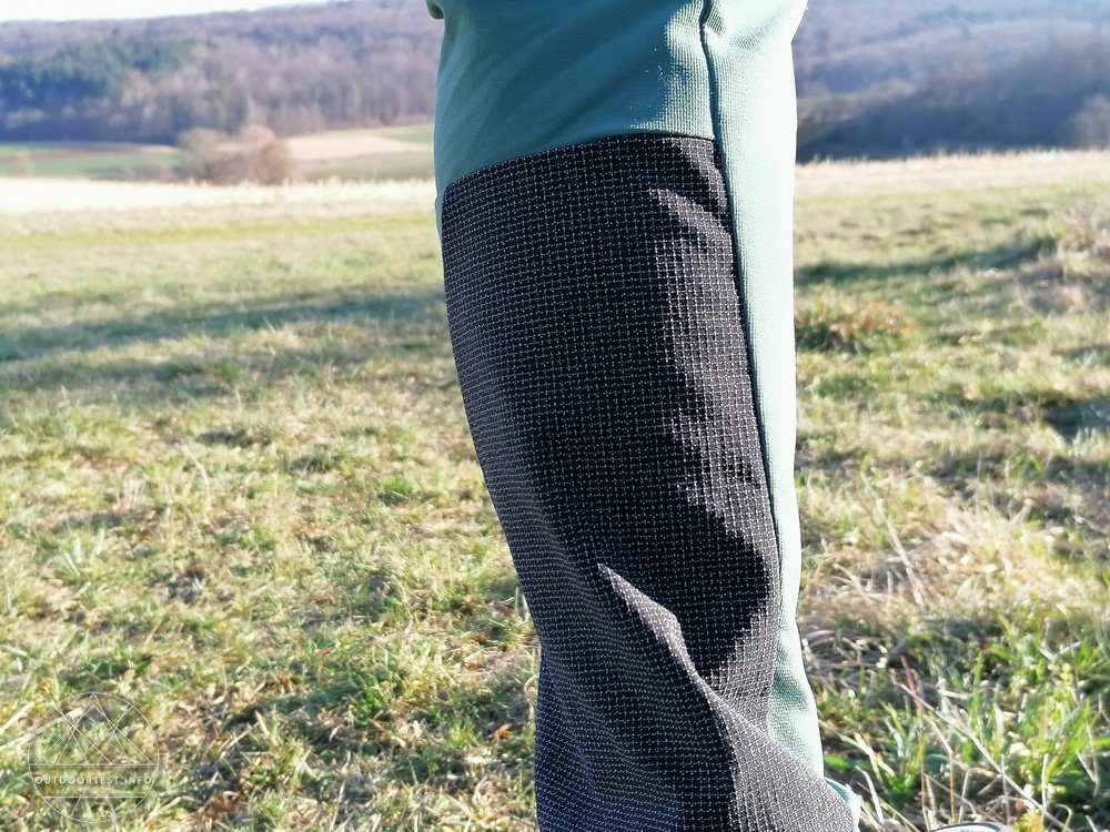 Die Tourenhose besteht aus hoch atmungsaktivem Material. Das ist wie Eingangs erwähnt absolut wichtig, da beim Aufstieg ein hoher Feuchtigkeitsaustausch zu bewältigen ist. Dass diese Feuchtigkeit schnell nach außen abgeleitet wird, das Gewebe bei nachlassender Transpiration schnell abtrockne,t ist nicht nur für das Wohlbefinden sondern auch zur Vermeidung von Erkältungen wichtig. Zudem ist das Gewebe winddicht. Trotz der Anstrengung kann einem eisiger Zugwind, womöglich noch auf einer schattigen Nordseite, ganz schön zusetzen. Mit einer wärmenden Schicht unter der Hose und ihren windabweisenden Eigenschaften ist man da ganz gut geschützt.