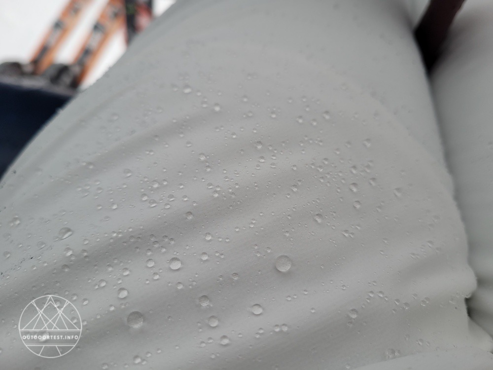 Verwendet wurde für dieses Modell das 20k/20k-Material (DWR 80/10 HL). Es schützt optimal bei Regen und Schnee (siehe Bild) und lässt einen darunter trotzdem atmen. Dank der DWR-Beschichtung (dauerhaft wasserabweisend) bietet es eine Wassersäule von 20 000 mm und 15 000 g/m²/24h Atmungsaktivität. So wird die Feuchtigkeit optimal abtransportiert.