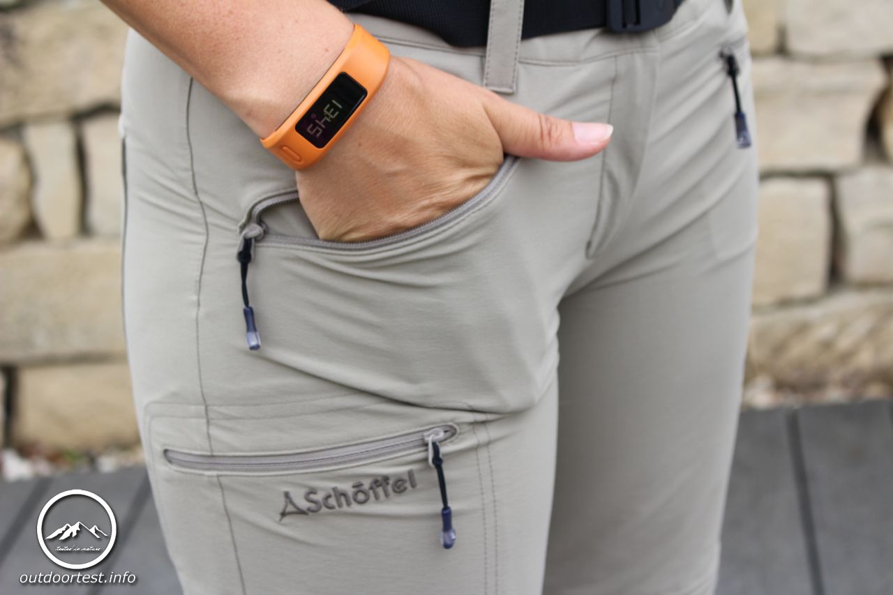 Die Einschubtaschen vorne sind mit Reißverschluss versehen. Dies ist angenehm und praktisch und verhindert, dass die Tasche beim Gehen oder Steigen aufklaffen kann. Die beiden Gesäßtaschen sind offen und von der Größe eher optisch angepasst, sprich: sie könnten gerne etwas größer sein. Dies gilt aber vor allem für die Oberschenkel-RV-Tasche. So schön es ist, für einen Damenoberschenkel eine kleine Tasche zu kreieren. Es passt keine Wanderkarte hinein! Für eine solche Hose eine Tasche so klein zu machen, dass eben keine Wanderkarte hinein passt, geht über mein Verständnis. Soll Frau rein technisch gestützt mit Navi oder App wandern? Oder nur mit Mann? Denn in die Männeroberschenkeltaschen passt sie so gut wie immer rein! Nein, auch Frauenwanderhosen sollten so emanzipiert sein und eine Karte aufnehmen können, damit FRAU auch ohne männlichen Geleitschutz ungestört wandern und Karte lesen kann.