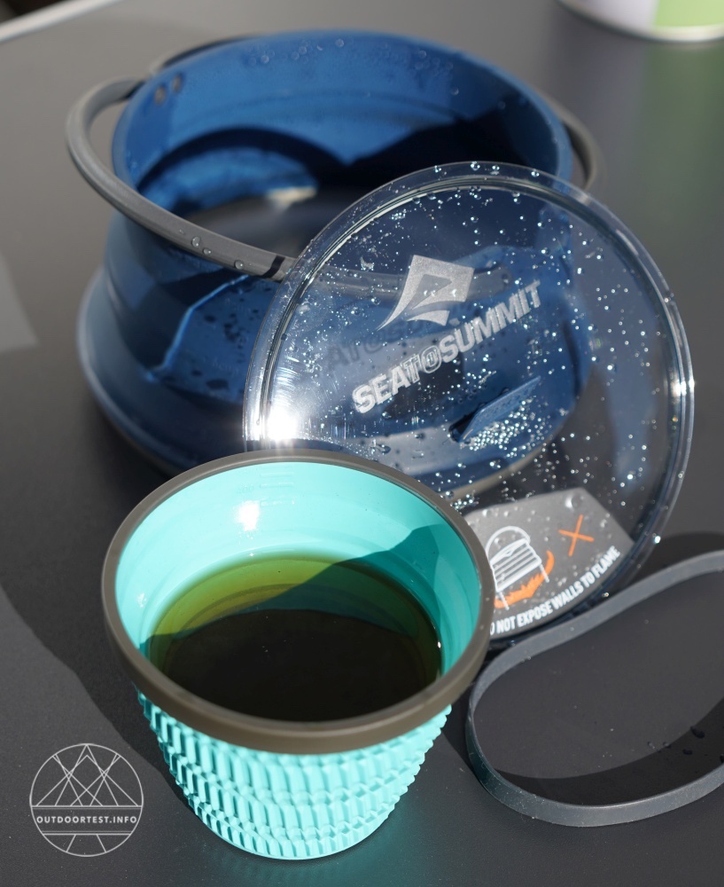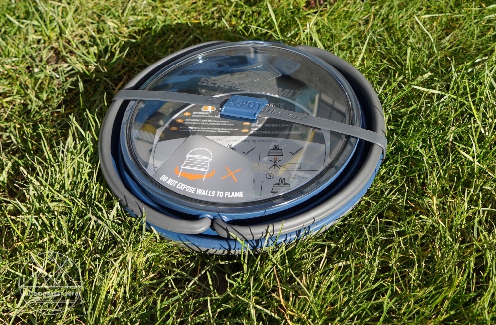 Der Topf wird im zusammengepackten Zustand von Sea To Summit geliefert. Rundherum wird Topf und Deckel durch ein breites Silikonband gesichert, so dass alles gut zusammenhält. So eingepackt wird der Topf vor allem durch den über den Rand hochgezogenen Aluminiumboden geschützt, während die eingeklappten Silikonwände sicher geschützt im Innenteil liegen.