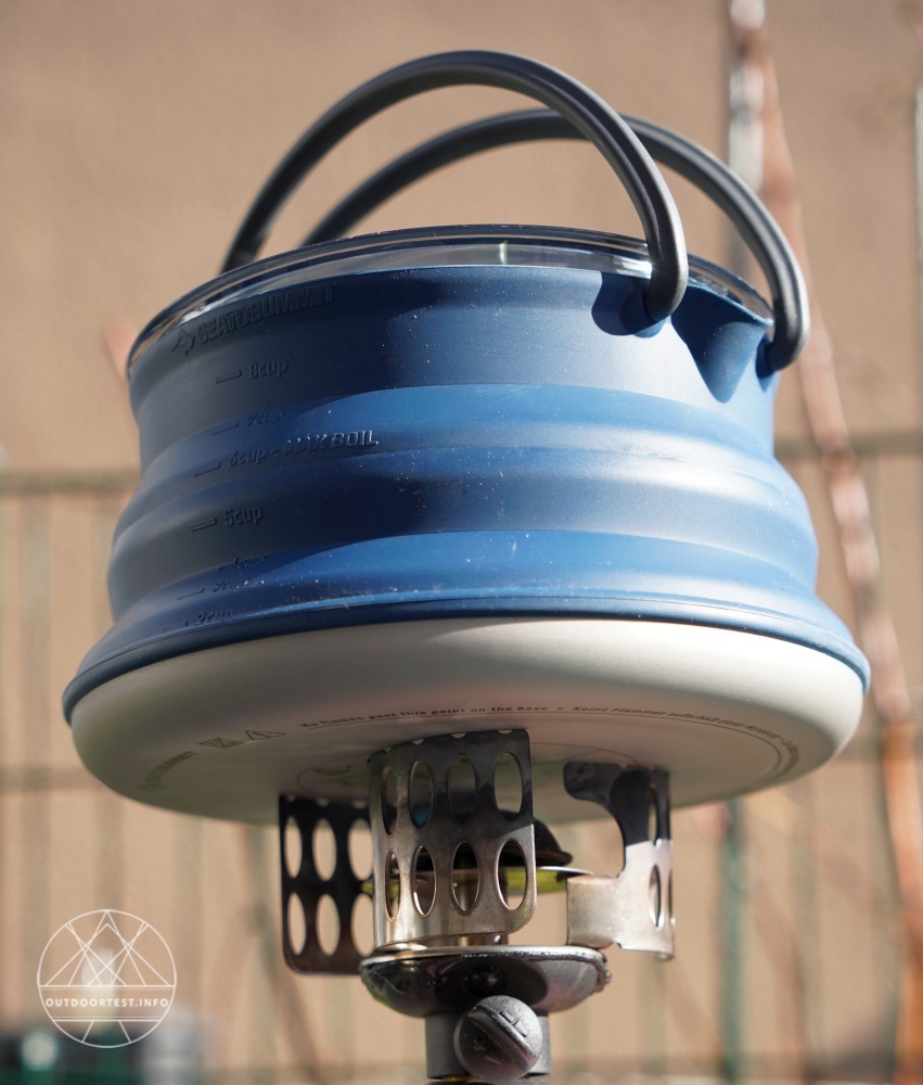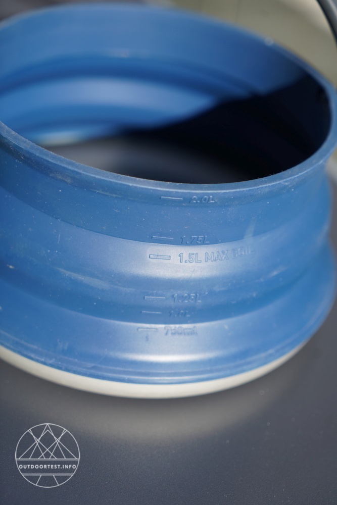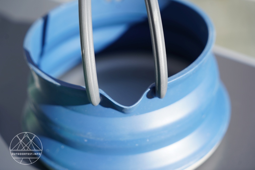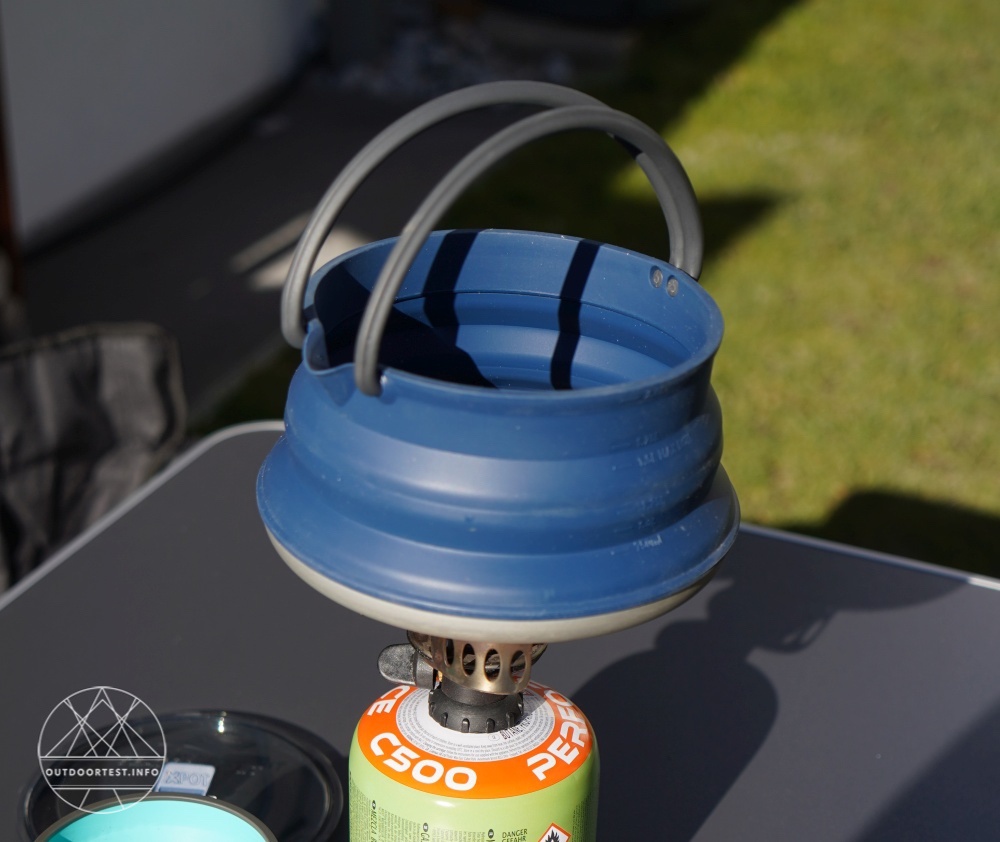 Ein „kettle“ im eigentlich englischen Sinne ist ja eine Kanne zum Wasser oder Tee kochen. Dieses Modell wird gemäß dem simplen Konzept der X-Serie von Sea to Summit ganz einfach ausgeklappt. Man zieht am eingeklappten Silikon und in zwei Stufen klappt das Gefäß von ungefähr 4cm auf fast die dreifache Höhe auf. Dazu gibt es noch zwei verstellbare Griffe, die sehr groß und handlich sind. Damit sieht der Topf dann wirklich aus wie eine klassische Teekanne.