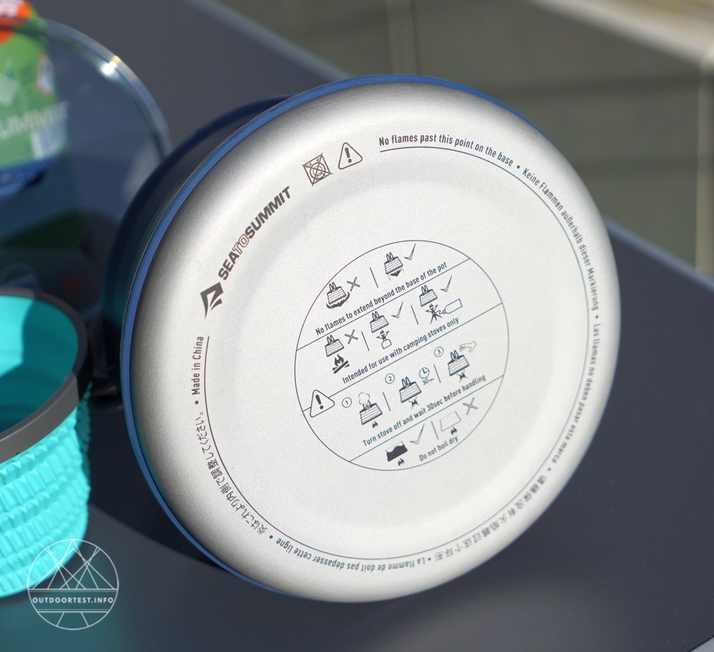 Die Unterseite des Topfes ist bedruckt – beim ersten Blick waren wir schwer erstaunt über die vielen Warnhinweise in Bild und mehrsprachigem Text. Aber am Ende ist es ganz einfach und mit gesundem Menschenverstand ist das auch völlig logisch: Die Flammen des Kochers dürfen nicht über die Alu-Bodenschale hinausreichen. Sonst würden möglicherweise die Silikonwände Schaden nehmen. Somit stellt man den Topf eben nicht ins offene Feuer, sondern auf einen normalen Campinggas-Kocher. Aber genau so sind wir beim Campen eh unterwegs.