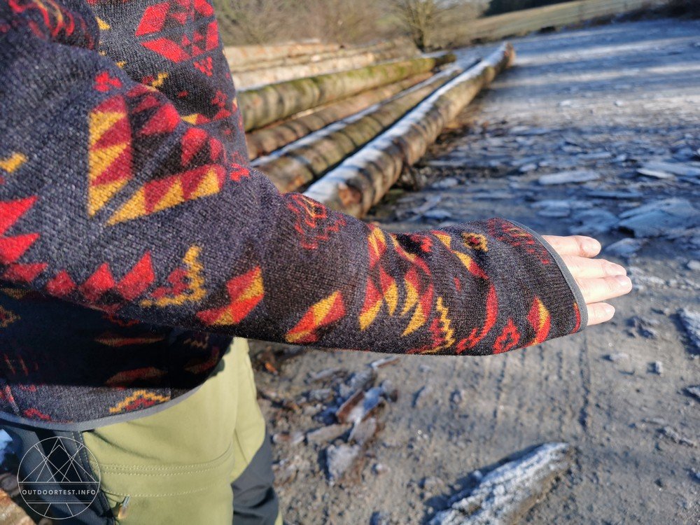 Packt man den Pullover aus, so sticht einem zunächst das interessante Jacquard-Muster ins Auge, welches nepalesisch inspiriert ist.
