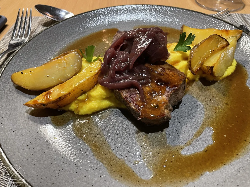 EatNach soviel Bewegung und aktiver Regeneration freuen wir uns sehr mit dem Dinner auch den letzten Aspekt des Move, Relax und Eat Konzeptes des Sportresorts genießen zu können. Jedes Zimmer bekommt einen Tisch zugewiesen, das vermittelte uns spätestens am zweiten Tag ein vertrautes Gefühl. Über unser Menü können wir aus zwei Vorspeisen, vier verschiedenen Hauptgerichten und zwei Desserts wählen, diese werden dann an den Tisch serviert. Den Salat und Suppen können wir uns vom Buffett holen. Unsere Servicekräfte sind sehr freundlich und aufmerksam, egal ob die Gläser oder der Teller leer sind.