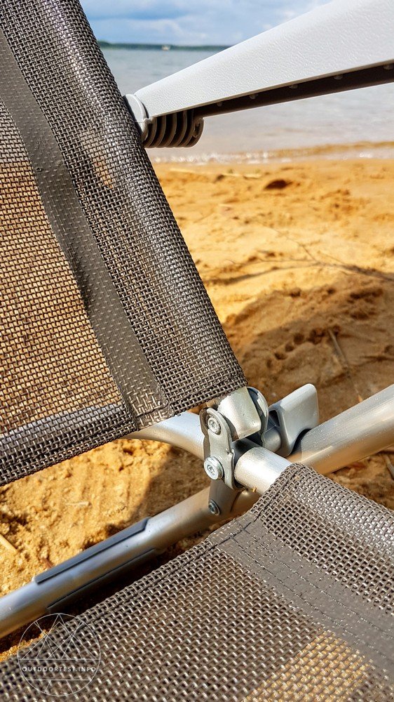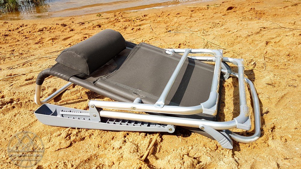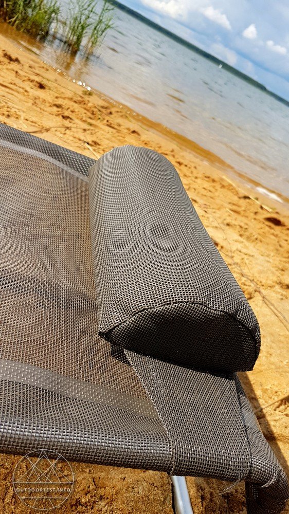 Das Packmaß beläuft sich auf 75x62x20cm und er wiegt gerade mal 3kg. Ganz flach lässt sich der Stuhl nicht zusammenklappen, da am Kopfteil das Aluminiumprofil nochmals nach hinten abgeformt ist, denn dies dient in der Liegeposition als zusätzliche Stütze, damit das Rücken-/Kopfteil nicht kippt und wippt.