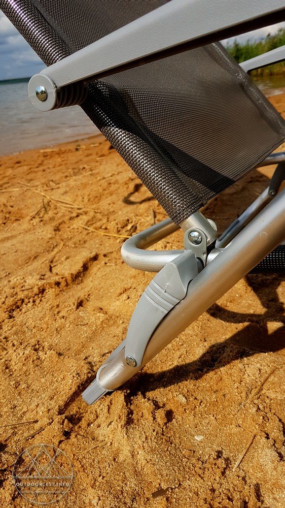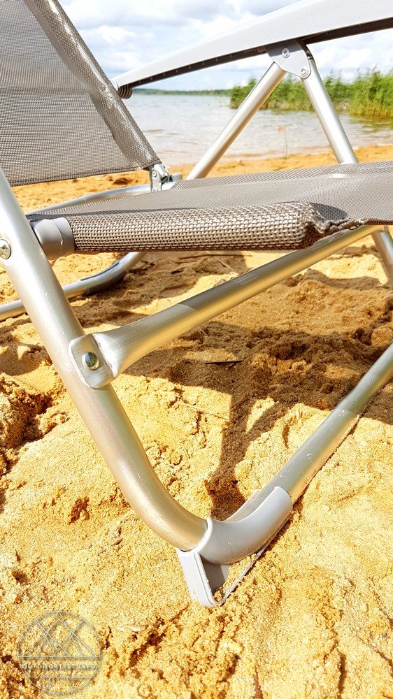 Der Strandstuhl liegt am Boden nicht nur auf dem durchgängigen Alurahmen auf, sondern hat an den vier äußeren Auflagepunkten ein Kunststoffprofil, dass für einen besseren Halt im Sand sorgen und dem Einsinken mit entgegen wirken soll.