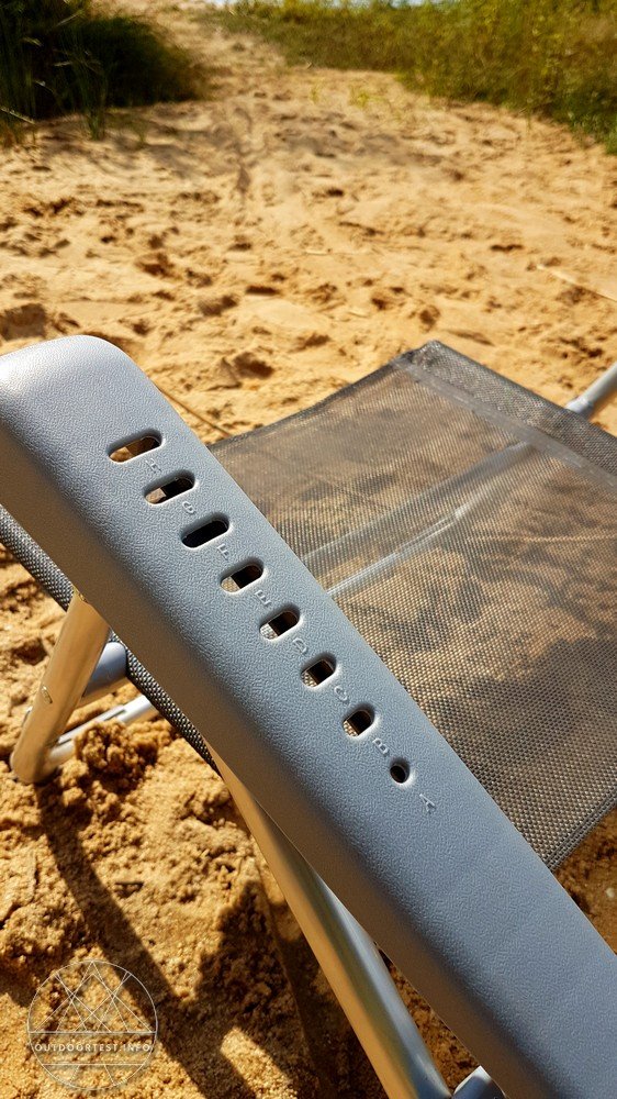Durch Anheben der Kunststoffarmlehnen kann der Neigungswinkel des Rückenteils ohne Probleme von einer aufrechten Sitzposition bis hin zur Liegeposition verstellt werden. Das Nacken- oder Kopfkissen ist leicht gepolstert und gibt eine gute Unterstützung. Es kann bei Bedarf in der Höhe verschoben oder ganz abgenommen werden. Dank dem zusätzlichen, weiterführenden Aluprofil im Kopfbereich (s. Bilder) kippt der Strandstuhl in Liegeposition nicht nach hinten ab oder wippt, sondern liegt dadurch satt auf dem Boden auf. Im zusammengeklappten Zustand steht der Stuhl leider auf diesem „Kopfstützen-Aluprofil“ recht gut, was dazu führt, dass dies zerkratzt.