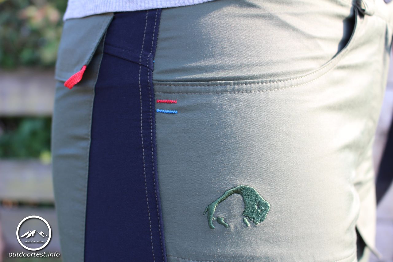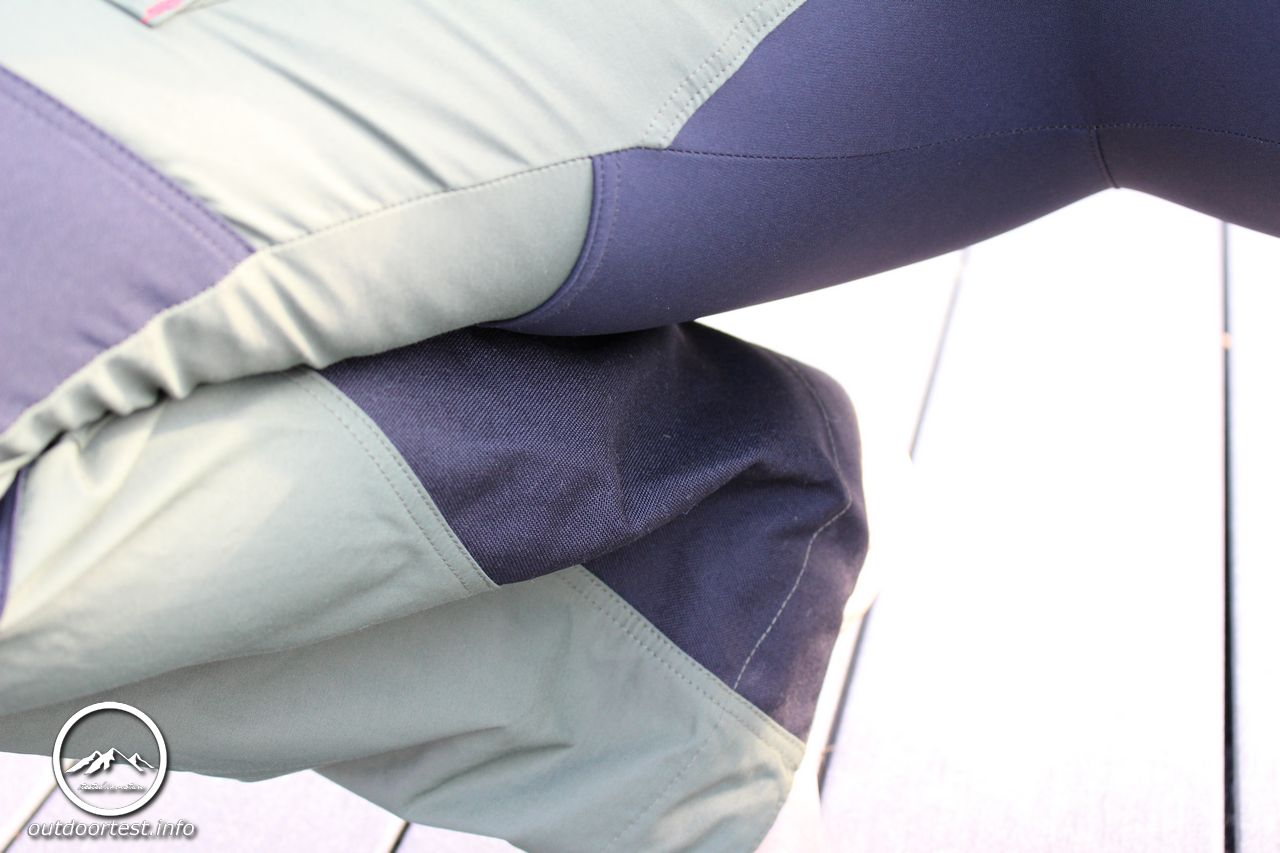 Die SoftShell-Einsätze an den Kniepartien und am Gesäß sind hoch dehnbar und machen wirklich jede Bewegung mit. Trotzdem ist das Gewebe griffig. Sowohl von außen als auch von innen. An der Innenseite hat es eine leicht aufgeraute Oberfläche, so dass der Stoff auch nicht so „kühl“ wirkt. Bei anderen Vertretern dieser Bauart ist es manchmal so, dass die Stretch-Schicht sehr dünn ist. Dann bringt es wenig, wenn der Beinstoff stark und schwer ist und auch für kühlere Tage bestens geeignet wäre, wenn es einen schon beim Gehen am Allerwertesten friert, vom Sitzen auf Fels oder kühlem Erdreich ganz zu schweigen. Es war beim Testen zu warm, um das abschließend bestätigen zu können. Aber die Stoffdicke lässt hoffen, dass dies bei dieser Hose anders ist. Im Schritt ist ebenfalls aus Stretchgewebe ein Zwickel eingearbeitet, bevor die vorderen Beinteile dann aus dem festeren Baumwollmischgewebe gefertigt sind.