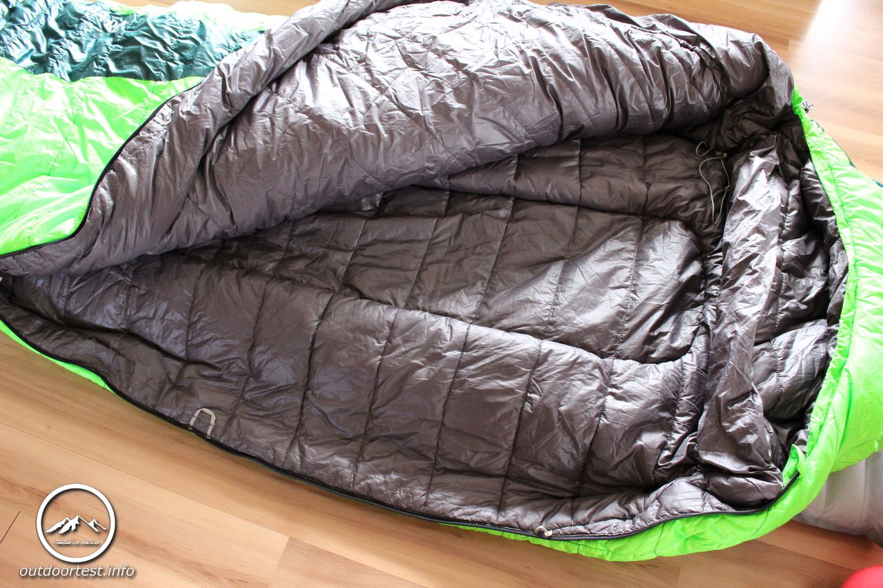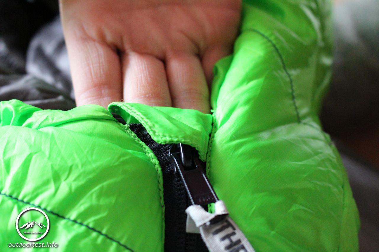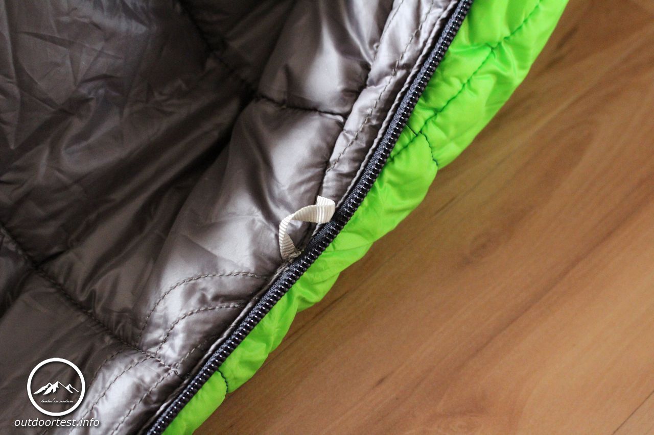 Nach dem Auspacken entfaltet der Schlafsack seine wirkliche Größe und so erklärt sich auch schnell das Volumen. Er ist spürbar dick, die Isolierungsschicht ist dick wattiert und locker. Der Fußteil ist ergonomisch vorgeformt. Der lange Reißverschluss ist von oben und unten zu öffnen. Der gesamte Reißverschluss ist von einer Wulst überdeckt, die ebenfalls dick wattiert ist um Kältebrücken zu verhindern. Leider gelingt dies nur teilweise. Die Wattierung wäre absolut ausreichend. Allerdings gerade weil die Wulst so prall ist ragt sie meist in das Schlafsackinnere hinein anstatt flach auf dem Reißverschluss zu liegen und legt diesen dann doch an vielen Stellen frei. Hier wären ein paar wenige Anknüpfungspunkte in welcher Form auch immer eine sichere Möglichkeit, dies zu verhindern.