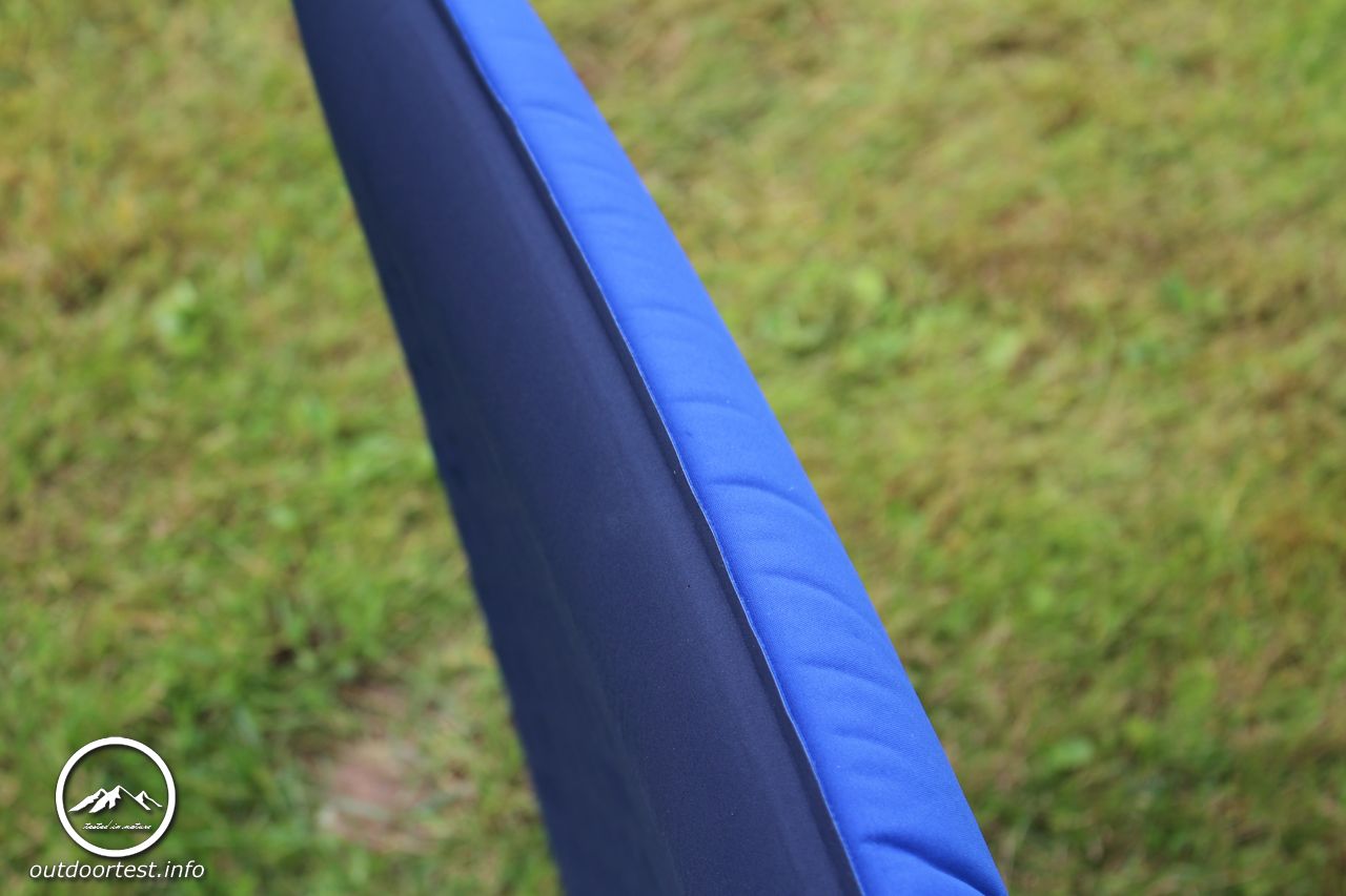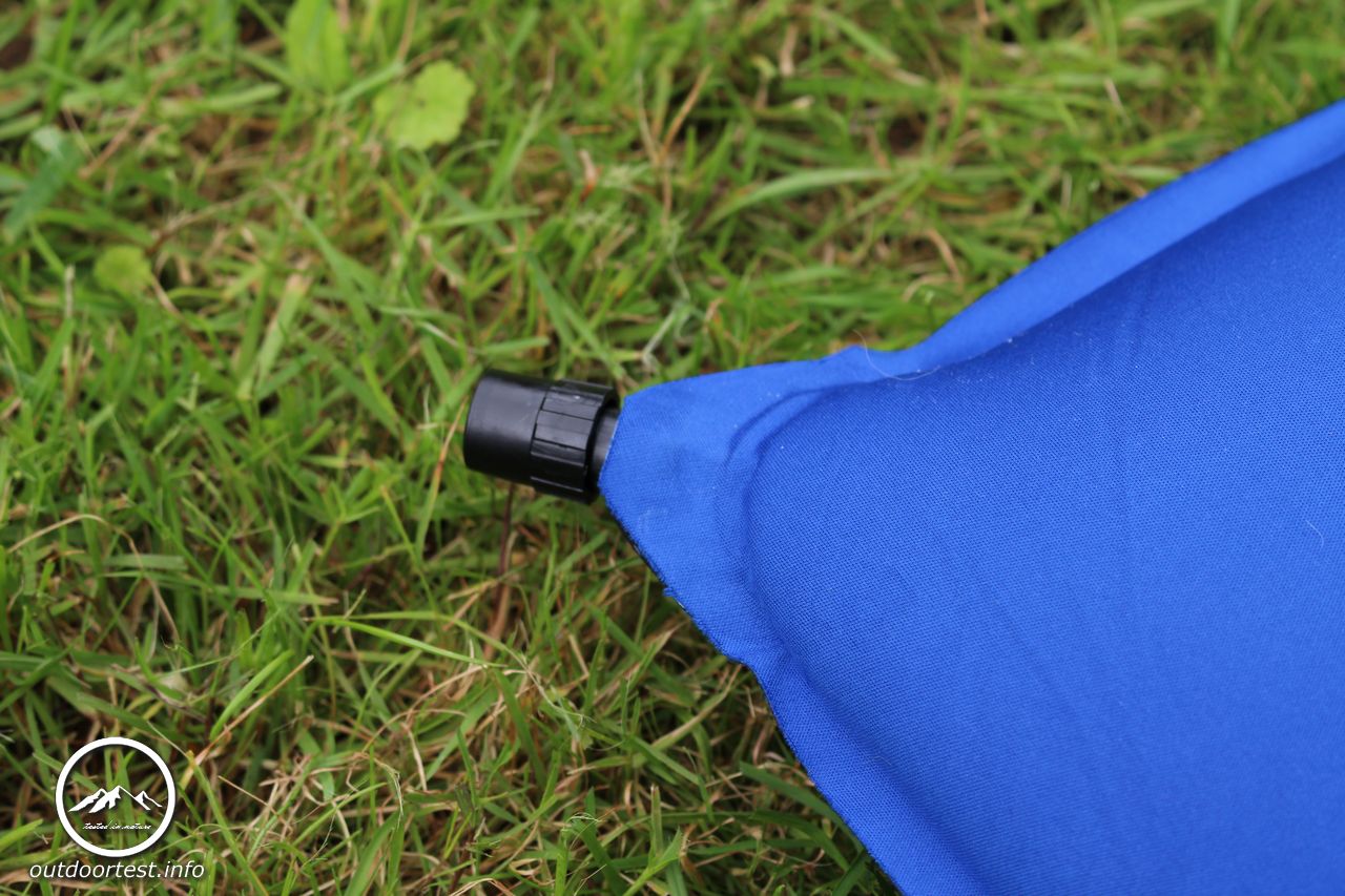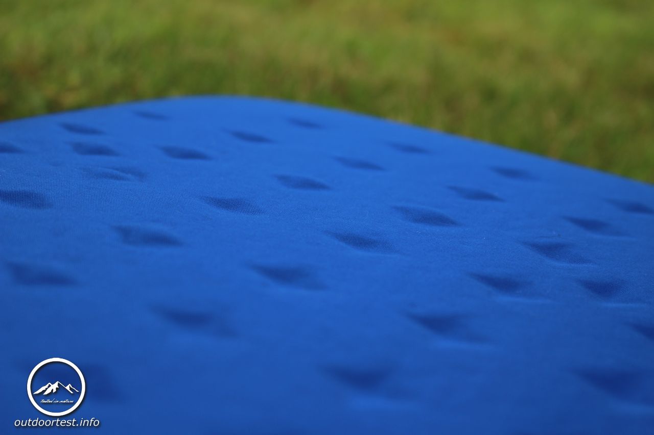 Es handelt sich um eine selbstaufblasbare Matratze. Diese sind beim Öffnen des Ventils so gebaut, dass sie sich selbst aufblasen und man eigentlich auch nicht manuell nachpusten soll, da sonst Feuchtigkeit ins Innere gelangt. Ganz ehrlich, ich habe noch keine selbstaufblasbare Matratze erlebt, die mir von der Dicke her gereicht hätte, wenn ich sie sich nur alleine aufblasen lasse. Ich puste sie immer noch zusätzlich auf. Im Sitzen spürt man den Untergrund durch. Allerdings nicht unangenehm, aber man spürt einfach, dass da der Grund kommt.