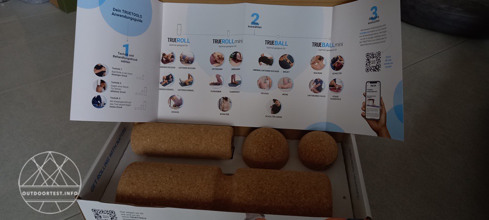 Die Lieferung besteht aus den beiden Truerolls unterschiedlicher Größe und den beiden Trueballs unterschiedlicher Größe. Sie werden in einem Karton mit einer kleinen Broschüre mit Kurzanleitungen geliefert. Mit diesem Massageset kann man selbst Hand anlegen und sich von Verspannungen und Faszienverklebungen befreien oder sie zumindest lindern. Zudem soll es beim Sport bei der Regenation helfen und die Beweglichkeit verbessern.